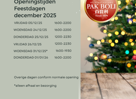 Samen gezellig & onbeperkt genieten. Uit eten bij Pak Boli is met recht een grenzeloze culinaire belevenis. U kunt bij ons onbeperkt genieten van onze wok, sushi’s en vele andere gerechten, waarbij al het eten en alle softdrinks inbegrepen zijn in een vaste prijs. Bovendien is het wokken een bijzonder gezellige bezigheid, met z’n tweeën of met een hele groep. Pak Boli staat garant voor een gezellige avond met eten van hoge kwaliteit. Het restaurant is geopend van woensdag tot en met zondag tussen 1645 uur en 2200 uur. Met feestdagen zijn wij ook op maandag of dinsdag geopend. Reserveren kan via email of 0181 620633 Klik hier voor de prijzen